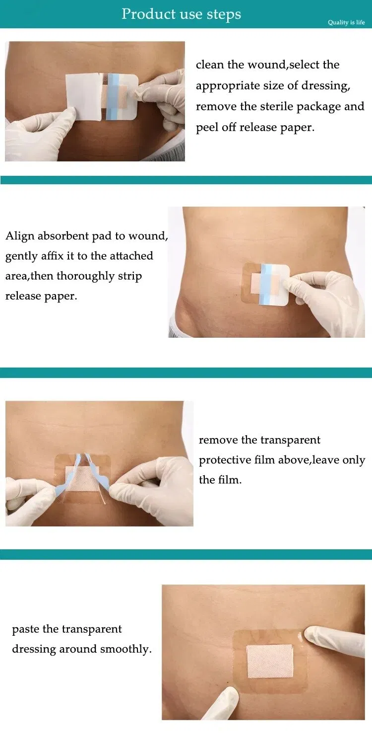Consists of air permeable waterborne PU film coated with specific medical adhesive, high absorbent cotton pad, and protection paper.